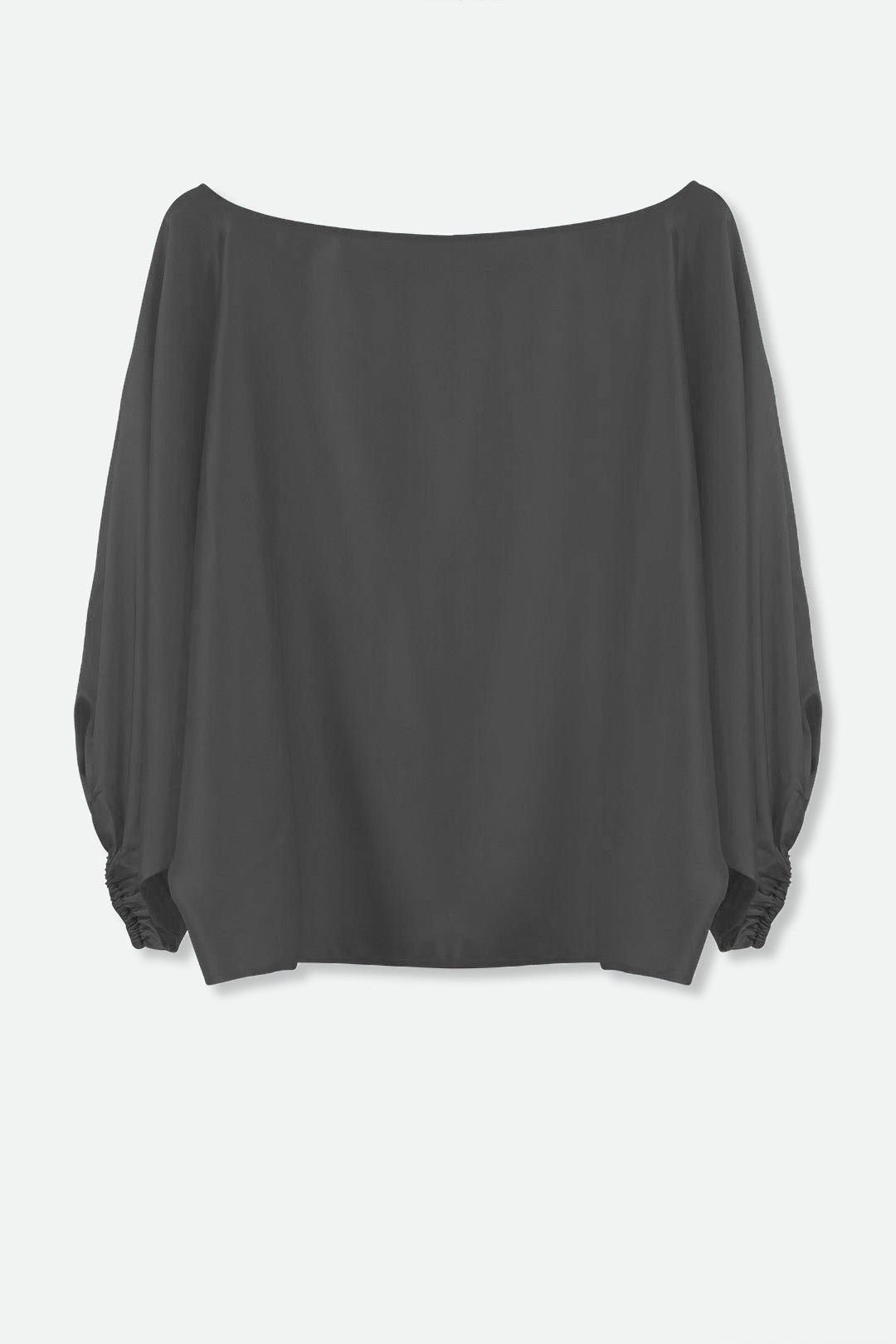 An easy-wear. one-size fits all top for oversized. beautiful drape styling in pure silk charmeuse. It features a wide. open-shoulder boatneck – wear it as an elegant wide neck or off-the-shoulder for a casual evening look. Complete with an easy. relaxed fit body and draping arm with a softly gathered elastic armhole — 3/4 sleeve length.